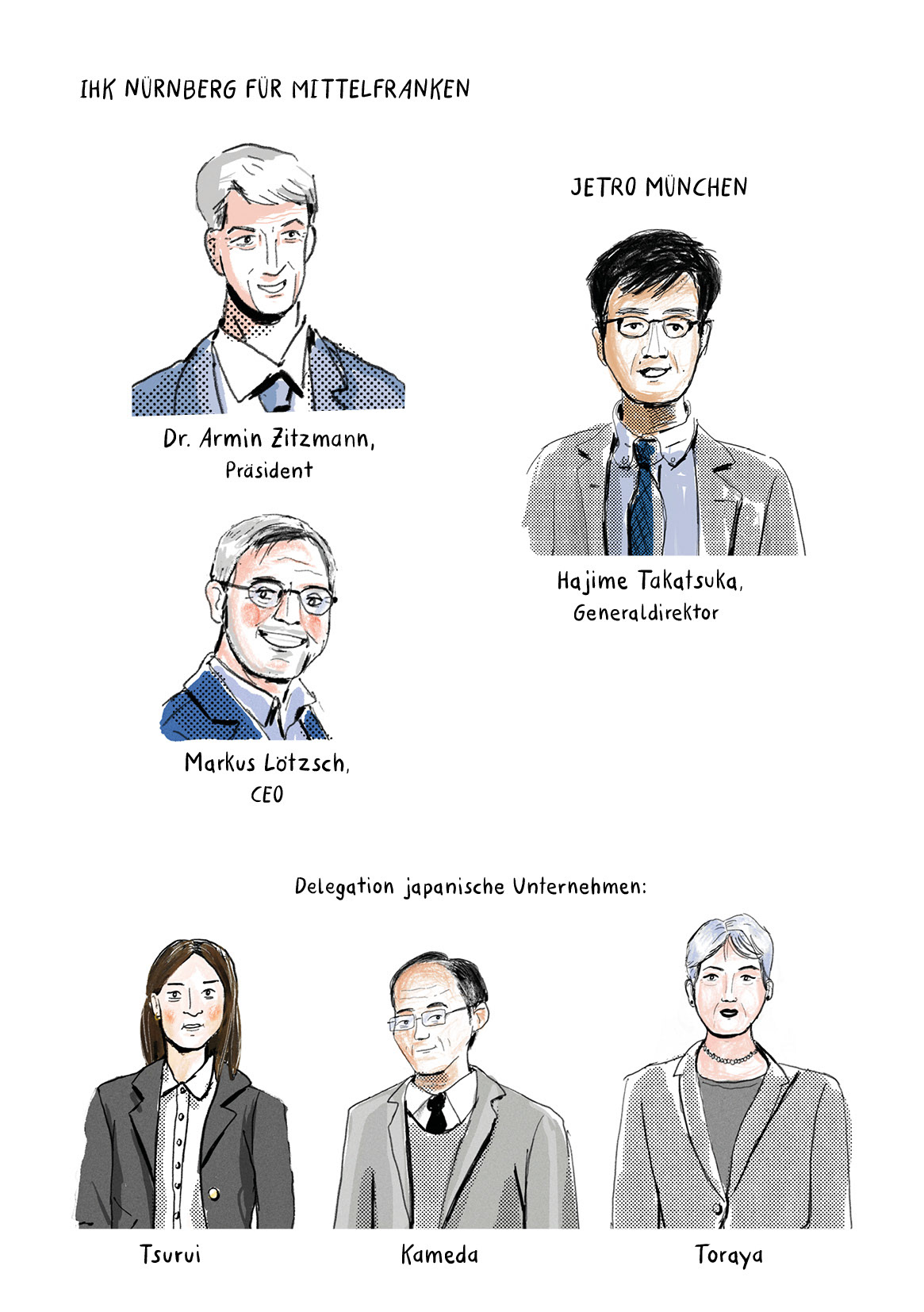 „In dem zwölfseitigen Heft, das an Stilmittel des japanischen Mangas angelehnt ist, spielen IHK-Präsident Dr. Armin Zitzmann und IHK-Hauptgeschäftsführer Markus Lötzsch, der die Idee zu dem Comic hatte, eine zentrale Rolle: Sie zeigen einer Delegation japanischer Geschäftsleute, in welchen Branchen und Technologiefeldern die Metropolregion punkten kann.