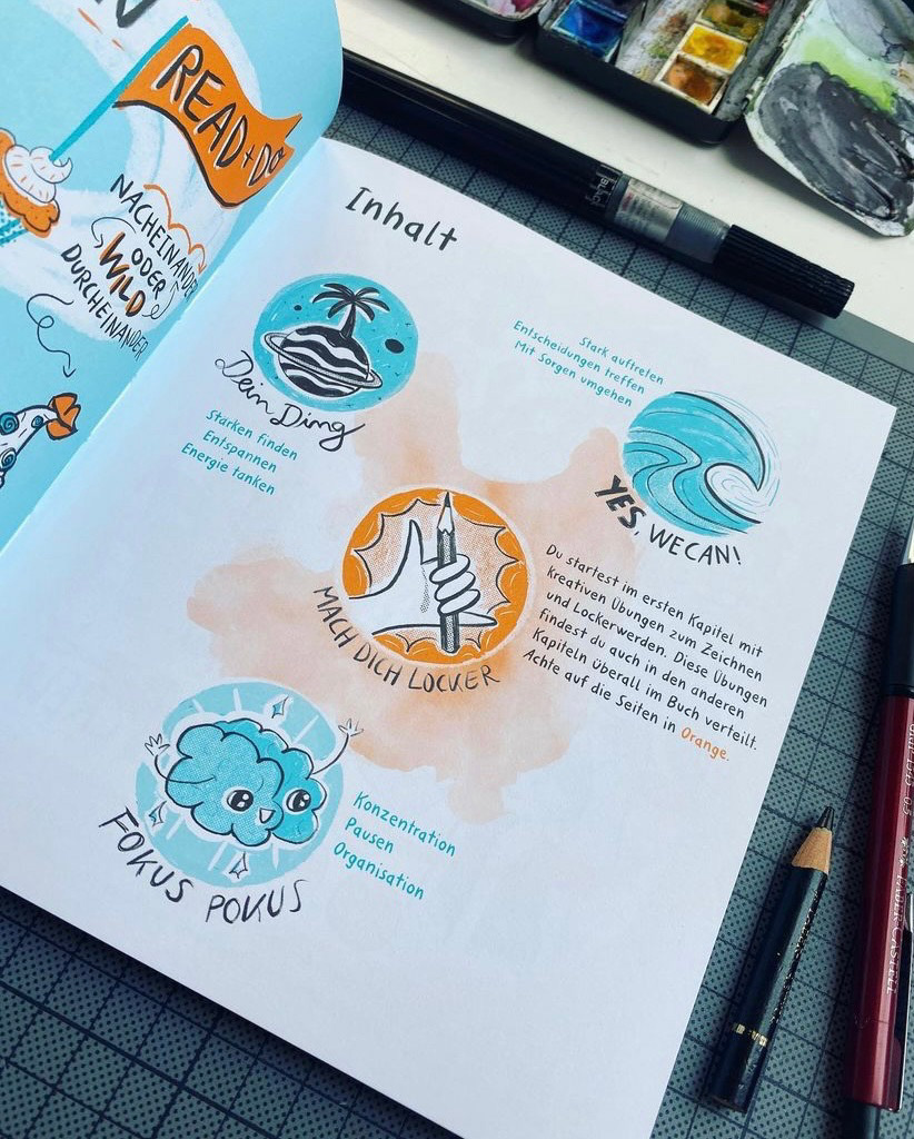 Comics für Jugendliche zur Identifikation mit Alltagserlebnissen, aber auch zur Vermittlung abstrakter Themen, wie die Gedanken- und Gefühlswelt. Das Buch "MEHR ALS STARK -- Gechillt durch Alltag und Schulstress" ist Teil meiner Masterarbeit „Ich-Stärke und Resilienz fördern durch sequenzielle Bilderzählung“ und eröffnet ein Spektrum aus kreativen Mitmachübungen mit Comic, Sketchnotes, Handlettering, Schreib- und Zeichenübungen in Kombination mit Reflektion, Entspannung und Selbstorganisation. Kernzielgruppe sind Kids und Teens zwischen 10 und 15.