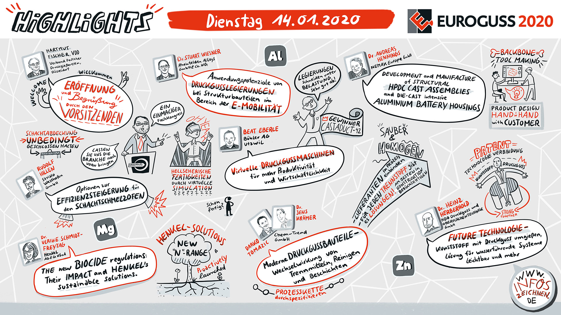 Graphic Recording für die Messe Euroguss 2020 in Nürnberg. Ich durfte ein Titelbild gestalten, die Fachvorträge der Druckgusstage visuell begleiten und Tageszusammenfassungen als Plakate gestalten. Sehr spannende, informative Messetage rund um eine innovative Branche!